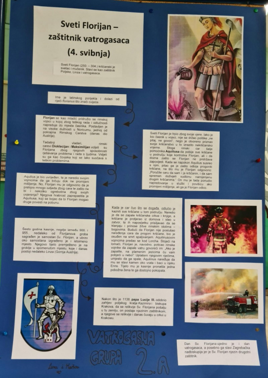 Članovi vatrogasne skupine, učenice i učenici 2.a razreda Škole za cestovni promet, nakon priprema za pokaznu vatrogasnu vježbu iz gašenja požara izradili su i postavili plakat „Sv. Florijan“ u predvorju škole te tako obilježili Međunarodni dan vatrogasaca.