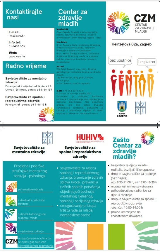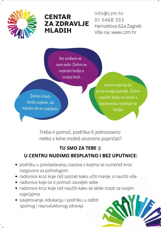 Imajući u vidu pojačane potrebe za brigom o mentalnom zdravlju djece i mladih tijekom pandemije COVID-19, a i neželjenih događaja izazvanih potresima, Grad Zagreb je osigurao učenicima zagrebačkih srednjih škola te njihovim roditeljima dodatnu podršku koju provode klinički psiholozi i magistri psihologije u Centru za zdravlje mladih Doma zdravlja Zagreb - Istok, Heinzelova 62a. Uloga Centra za zdravlje mladih je povećati dostupnost zdravstvenih sadržaja vezanih za zaštitu mentalnog zdravlja i promociju zdravih stilova života djece i mladih, te zaštitu spolnog i reproduktivnog zdravlja mladih osoba. Sve usluge Centra su besplatne za korisnike i za njih nije potrebna uputnica liječnika.