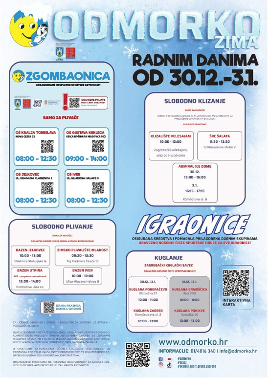 Školski sportski savez Grada Zagreba tijekom zimskog odmora učenika organizira program Odmorko zima 2025. Program će se provoditi od 30. prosinca 2024. godine do 3. siječnja 2025. godine. U okviru ovogodišnjeg programa učenici će moći koristiti plivališta Iver, Utrina, Jelkovec i Zimsko plivalište Mladost te klizališta ŠRC Šalata, klizalište Velesajam i Admiral Ice Dome.