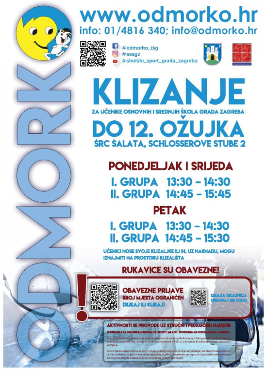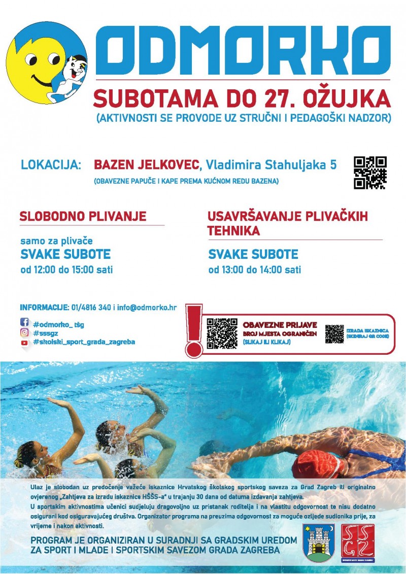 Školski sportski savez Grada Zagreba nastavlja sa slobodnim klizanjem na ŠRC Šalata, slobodnim plivanjem i usavršavanjem plivačkih tehnika na bazenu Jelkovec u okviru programa Odmorko tijekom školske godine.