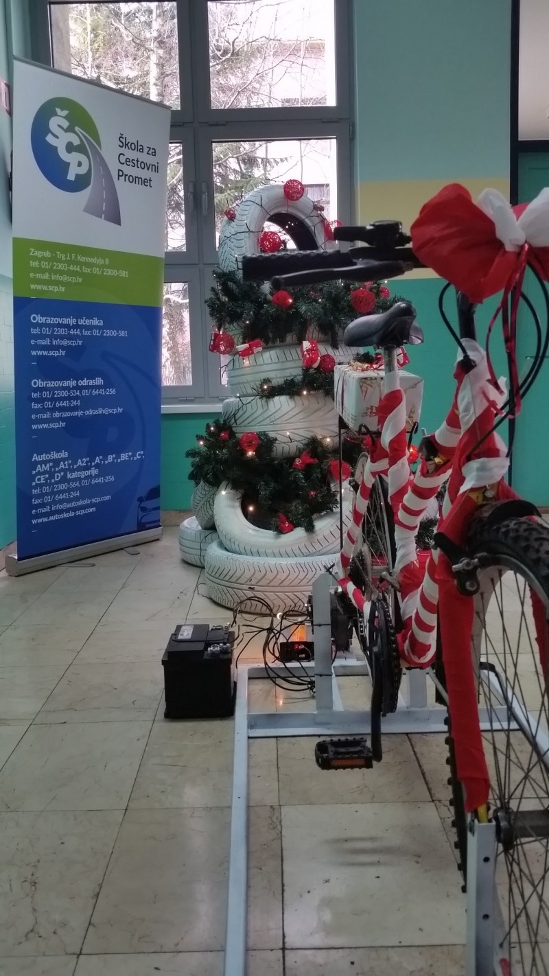 Ove godine odlučili smo dočekati Božić izradom "unikatnog bora". Udružili smo snage i u predvorje naše škole postavili instalaciju koja ne može proći neprimjetno.Volonterski klub, uz vodstvo profesorice Valentine Židak Radić, izradio je bor od recikliranih automobilskih guma i ukrasio cijelu instalaciju. Učenici 1.c razreda (Marko Hmelina, Petar Ačkar, Tomislav Trogrlić i Jakov Lagetar) uz vodstvo profesora fizike Jure Ajduka te uz pomoć našeg domara Vladimira Balaška preuredili su stari bicikl u "bicikl za proizvodnju struje"koja će se koristiti za napajanje lampica na našem boru. A sad je red na vama da zavrtite pedale i omogućite našim lampicama da svijetle!