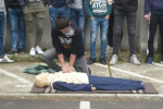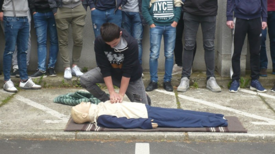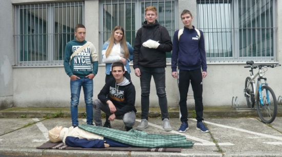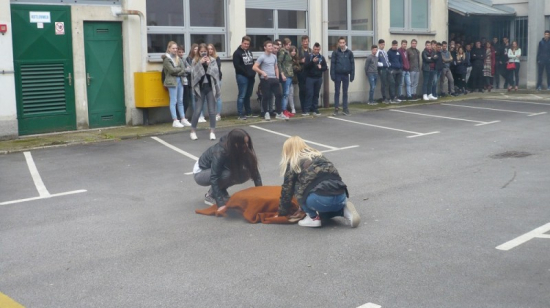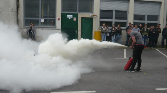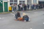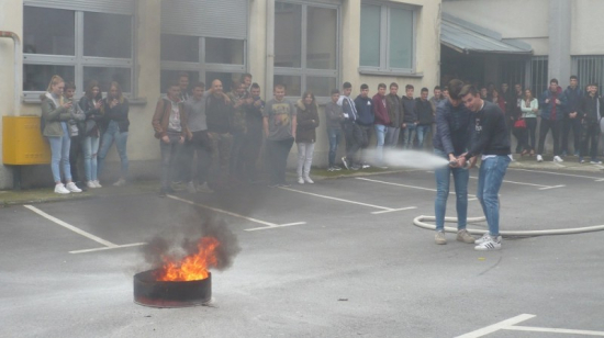 Učenici, nastavnici i ostalo osoblje ŠCP-a evakuirali su se i sakupili u školskom dvorištu gdje su učenici i učenice 2. B i 2. C razreda izveli pokazne vježbe: gašenje požara ugušivanjem priručnim sredstvom – narančastocrnom ili sad već crnonarančastom dekom (Ema Domitrović i Sara Korjenić), vatrogasnim aparatom sa suhim prahom (Tin Štefanac) te vodom (Natali Ivšak, Dominik Strelar, Petar Ačkar i Tomislav Trogrlić) i pružanje prve pomoći. Na lutki Annie masažu srca žustro je pokazivao Tristan Filipčić. Lea Dujaković imala je imobiliziranu nadlakticu, Petar Radoš šaku, Nikola Radić Tunjić rame, a Marin Tomić ključnu kost.