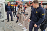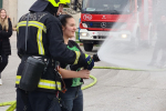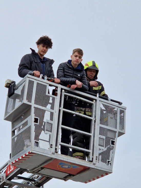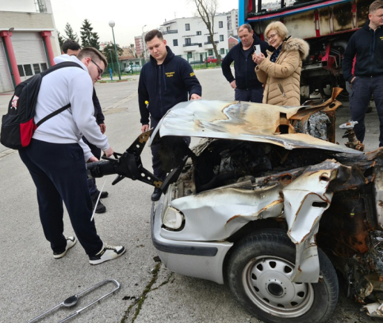 Pokazali su nam i objasnili svrhu dijelova opreme vatrogasaca i vatrogasnih vozila. Goran je isprobao vatrogasno odijelo, kacigu i čizme i okušao se u rezanju dijelova vozila specijalnim škarama. Provozali smo se vježbalištem u navalnom vozilu pod sirenom, koristili se vodenim šmrkom, a oni najhrabriji vinuli su se nebu pod oblake u košari vozila s ljestvama.