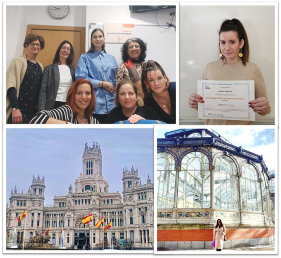Školska tajnica Andrea Vejnović pohađala je tečaj pod nazivom „How digital tools can help running your school“ u Madridu. Svrha tečaja bila je osvijestiti značaj digitalizacije administrativnih i nastavnih procesa s ciljem jačanja održivog načina poslovanja. Kroz niz aplikacija i programskih rješenja, sudionici tečaja ovladali su korištenjem alata kojima mogu povećati učinkovitost poslovanja, smanjiti količinu papira te kako potaknuti ostale zaposlenike na služenje digitalnim alatima. Ujedno, kroz razmjenu iskustava polaznika tečaja iz različitih europskih zemalja, uočene su zajedničke slabosti koje je potrebno nadvladati kako bi se što prije implementirala dostupna digitalna rješenja i poslovanje učinilo efikasnijim i održivijim. U sklopu kulturoloških aktivnosti, organizirana je vođena tura madridskom četvrti Malasana, koja ima povijesni značaj i simbol je borbe i otpora protiv Francove diktature, a u suvremeno doba predstavlja središte i okupljalište suvremenih španjolskih umjetnika.