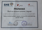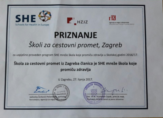Škola za cestovni promet je 27. lipnja 2017. godine dobila certifikat kao dokaz da je uključena u Europsku mrežu škola koje promiču zdravlje (SHE - Schools for health in Europe).