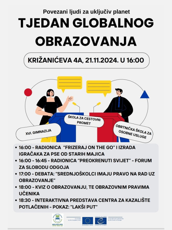 Sudjelovali smo u projektu Vijeća Europe – Tjedan globalnog obrazovanja, koji je ove godine održan pod sloganom Povezani ljudi za uključiv planet. Naše događanje, pod nazivom Tri škole – jedan svijet, održano je u četvrtak, 21. studenog, u prostoru XVI. gimnazije, a realizirano je u suradnji s XVI. gimnazijom, Obrtničkom školom za osobne usluge, Forumom za slobodu odgoja i Centrom za kazalište potlačenih – POKAZ.