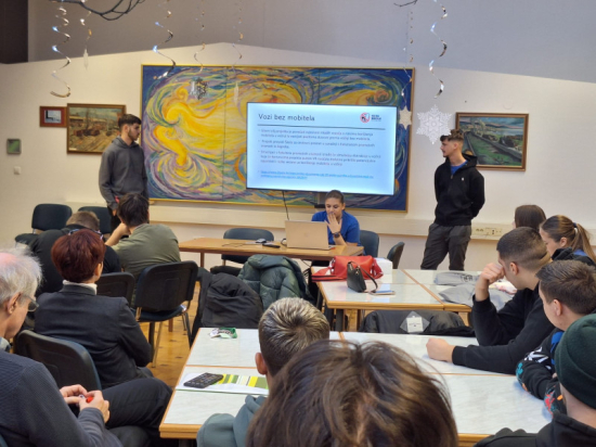 Projekt Vozi bez mobitela u gradu na Dravi, Mariboru. Tijekom sudjelovanja na mobilnostima u sklopu ERASMUS+ projekta Perpetuum Mobile 9 uz pratnju profesorice Željke Turković učenici su prezentirali projekt Vozi bez mobitela koji se provodio diljem Lijepe naše. Koliki je neprijatelj i koje opasnosti skriva korištenje mobitela u prometu objasnili su učenici naše škole. Edukaciji su prisustvovali učenici i nastavnici Prometne šole Maribor.